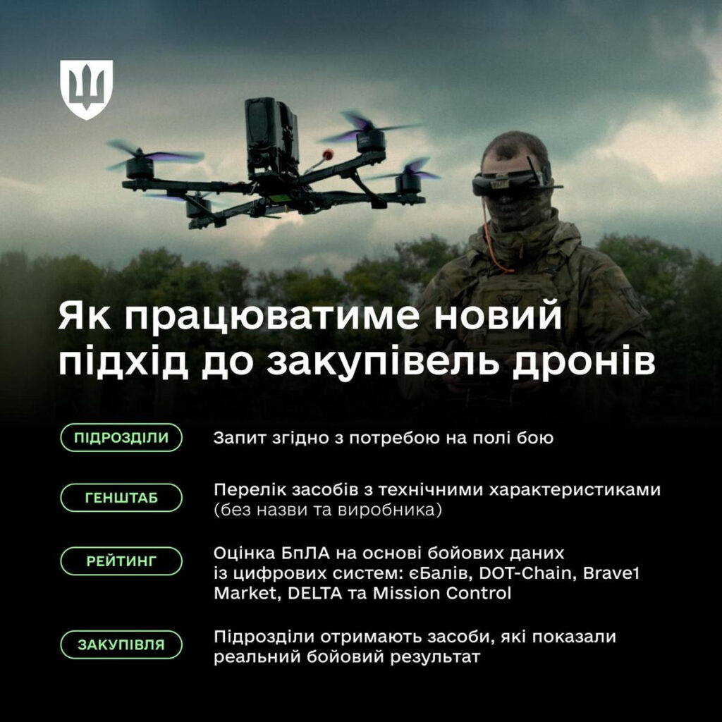 “Яким буде новий процес закупівлі? Генеральний штаб за запитом підрозділів формуватиме перелік тільки з технічними характеристиками засобів — без назви БпЛА чи конкретного виробника. Які саме вироби відповідно до бойових завдань закуповувати для підрозділів на фронті — визначатиме рейтинг БпЛА на основі бойових даних із цифрових систем: єБалів, DOT-Chain, Brave1 Market, DELTA та Mission Control”, — розповів Федоров.