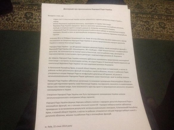 Вечером 22 января после встречи оппозиционных лидеров с президентом в доме профсоюзов начались учредительное собрание Народной Рады Украины, на которых присутствовали оппозиционные и внефракционные депутаты, передает ТСН.