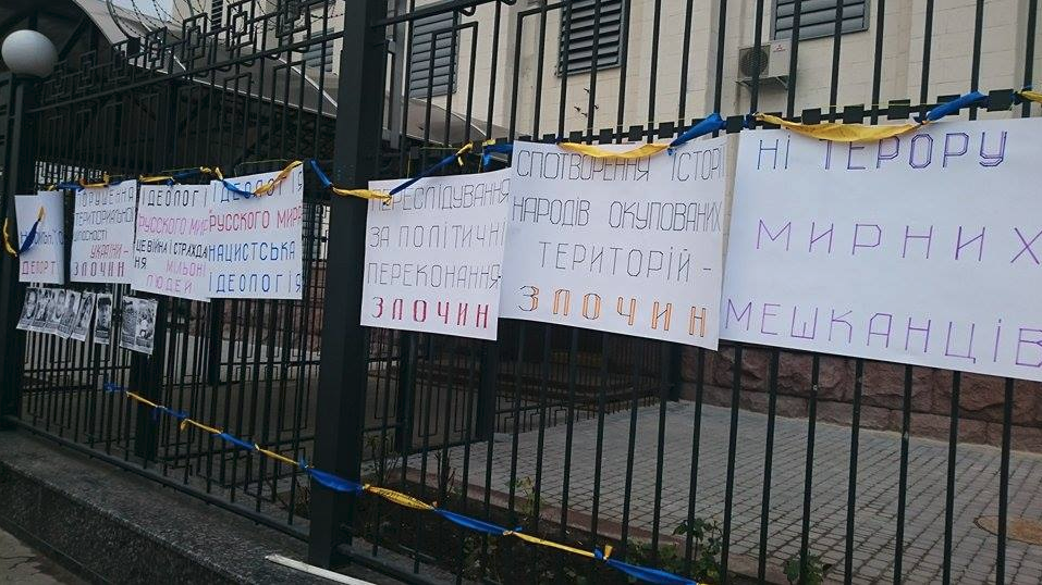 В Киеве у здания посольства РФ проходит акция-перфоманс “Русский мир” = мир бесправия”, участники которой таким образом решили выразить свой протест против агрессии России по отношению к Украине, а также привлечь внимание к нарушению прав человека в со стороны оккупационных “властей” Крыма.