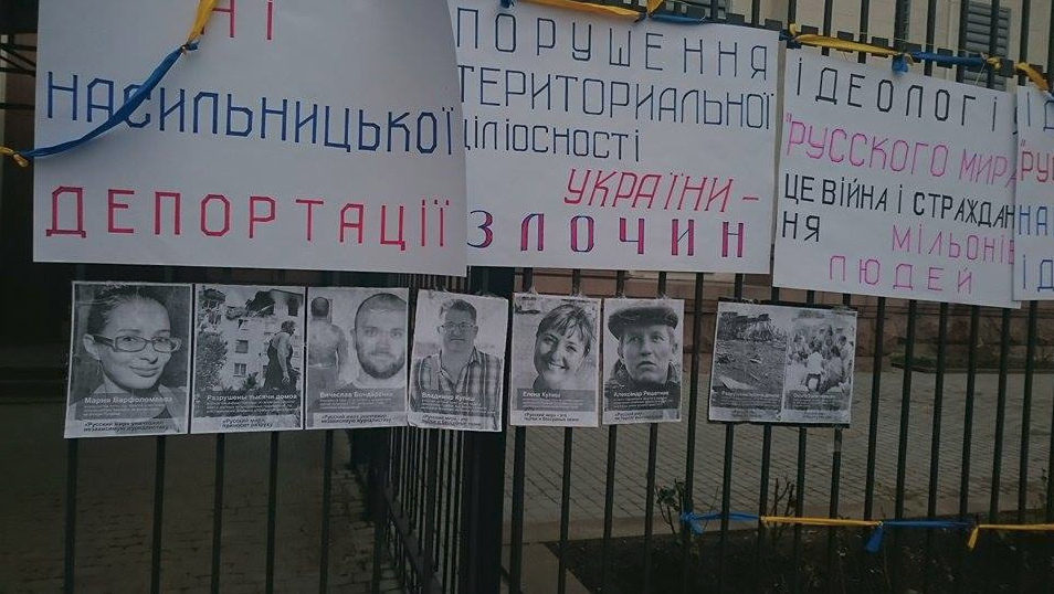 Активисты повесили на заборе посольства плакаты: “Нет насильственной депортации”, “Идеология “Русского мира” –  нацистская идеология”, “Нет террору мирных жителей”, а также портреты украинских волонтеров, журналистов и активистов, которые пострадали от российской агрессии.