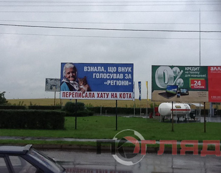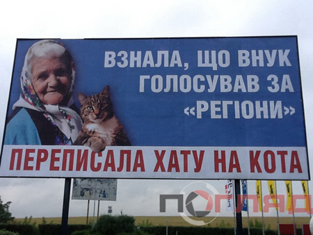 Напомним, две недели назад на Днепропетровщине появился рекламный билборд с бабушкой и котом с надписью: «Узнала, что внук проголосовал за „регионы“, переписала хату на кота». По приказу губернатора билборд был уничтожен. После этого в интернете появились демотиваторы с бабушками и котиками, которые уже получили название Babussy Cat.