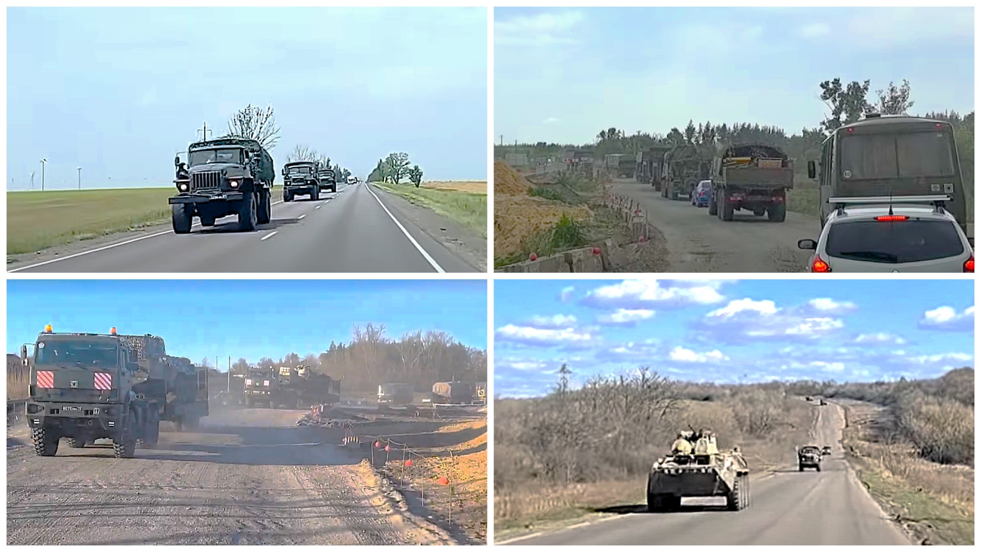 Колони техніки російської окупаційної армії на сухопутному коридорі в квітні-червні 2024 р. Джерело фото: соцмережі. Колаж: investigator.org. .ua