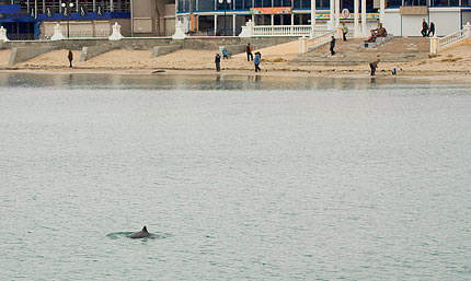 Около тридцати дельфинов сегодня утром подплыли к пляжу Евпатории в районе курзала. Около 15 дельфинов плавали у самого причала, откуда летом уходят на морские прогулки корабли, и в глубине залива, передает сайт Евпаторийского горсовета.