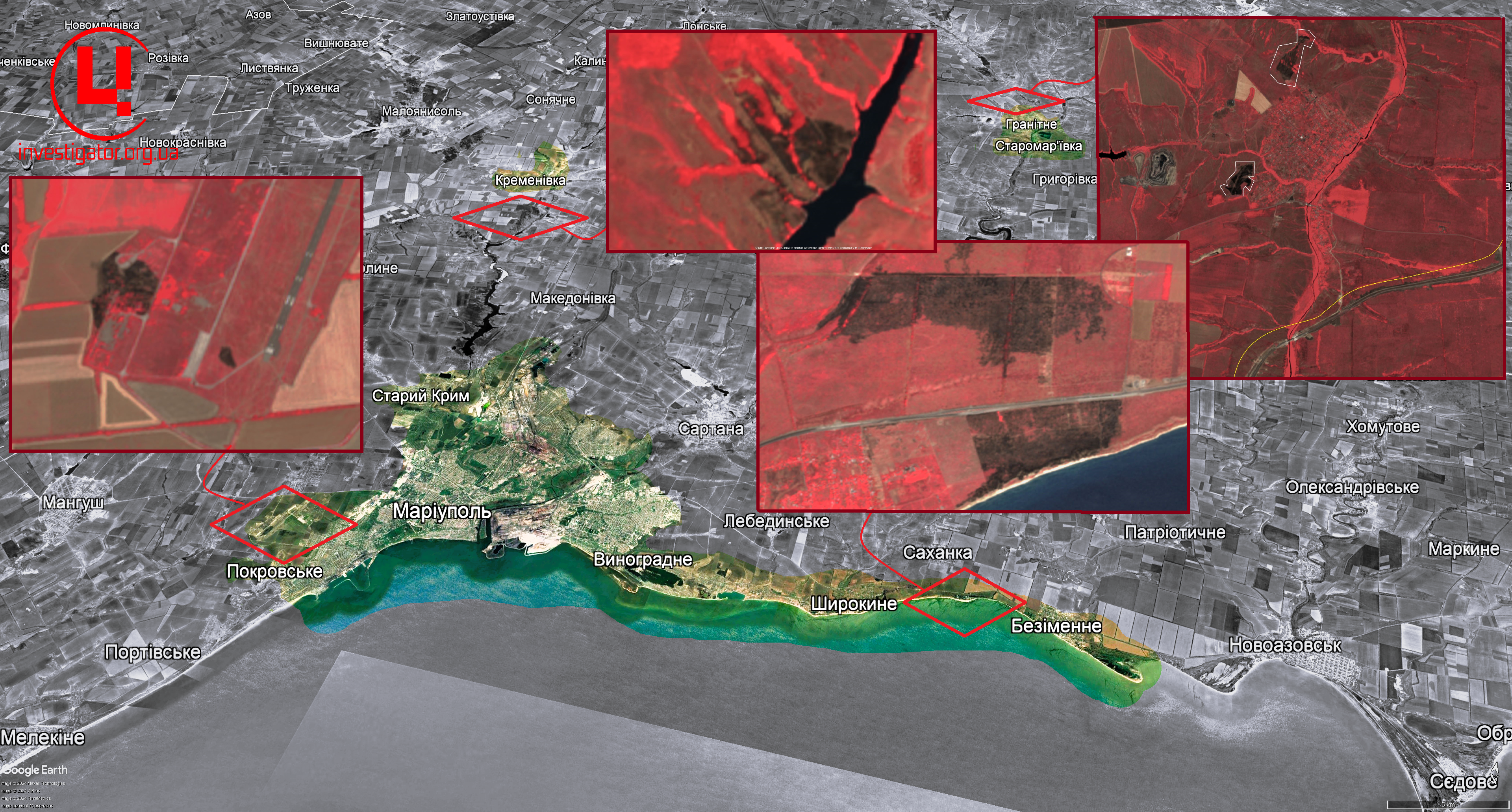 Згарища після ймовірних ударів по російській окупаційний армії на ТОТ півдня Донецької області з 20.06.2024 – 23.06.2024 р. Джерело фото: супутник Sentinel-2, сервіс Google Earth Колаж: investigator.org.ua