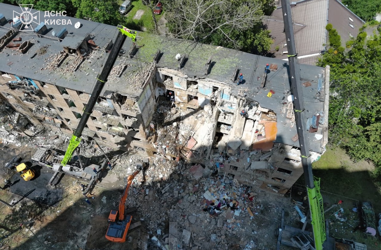 У Києві завершені пошуково-рятувальні роботи на місці російського ракетного удару 23 червня по житловому будинку у Шевченківському районі. Кількість загиблих збільшилась до дев’яти осіб, серед них – дитина, поранені 36 людей.