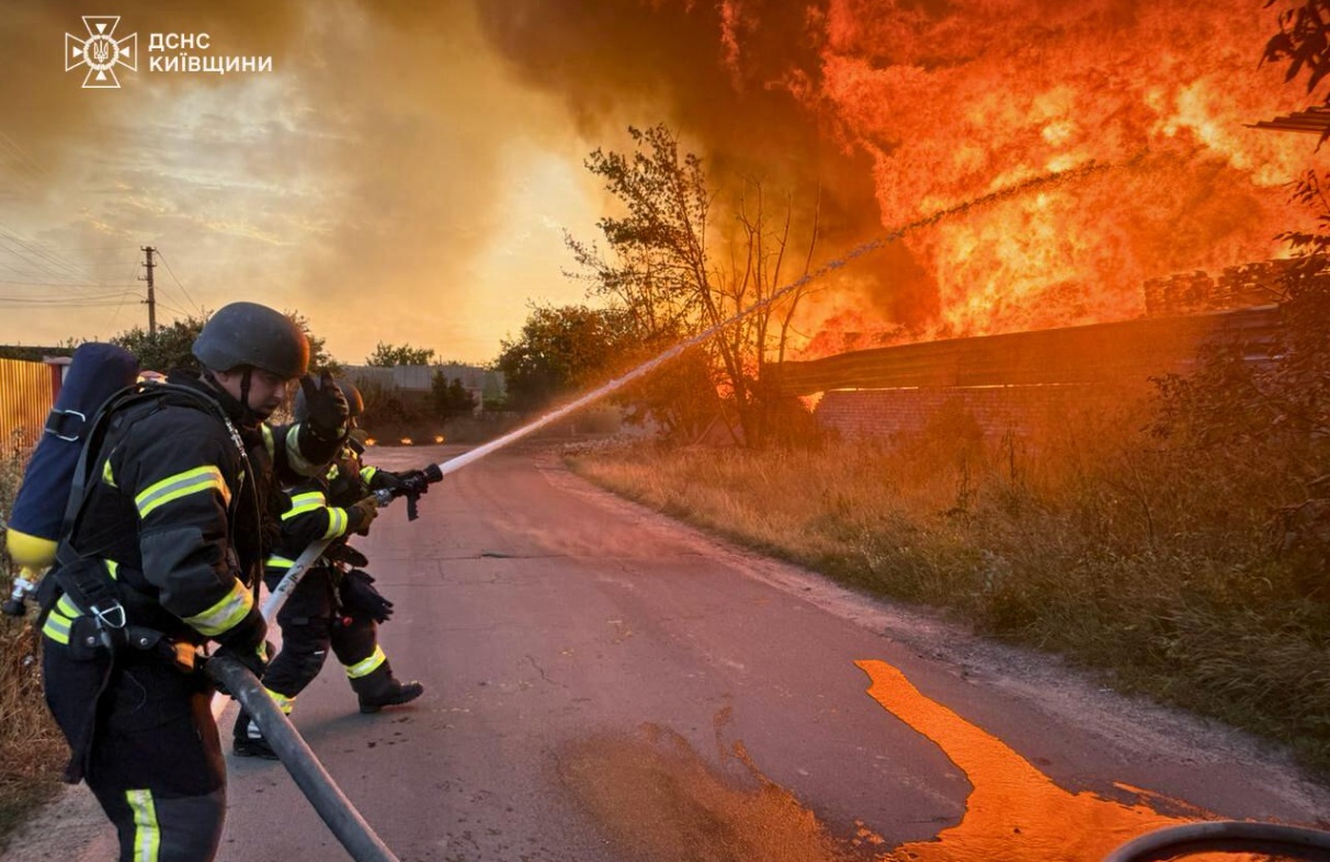 Рятувальники гасять пожежу після російської атаки на Київську область, 09.07.2025. Фото: facebook.com/DSNS.GOV.UA