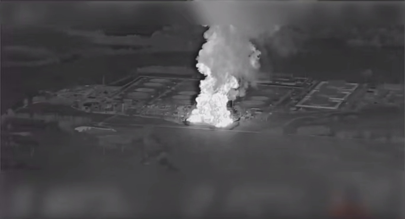 Пожежа на нафтоперекачувальній станції «Унеча» нафтопроводу «Дружба» після удару СБС ЗСУ, знятая камерою українського дрона, 21.08.2025. Фото: t.me/robert_magyar