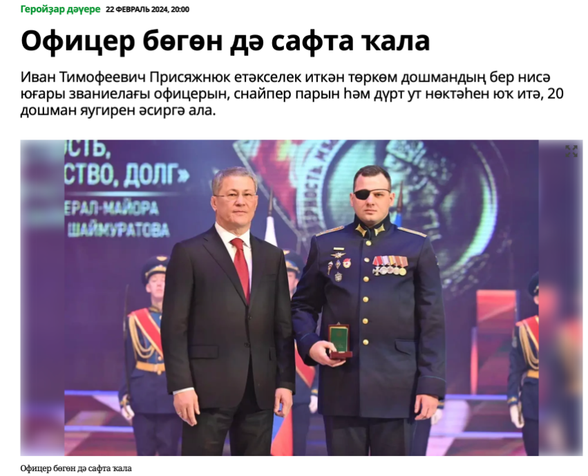 Как сообщили в российских медиа, вскоре Присяжнюк получил тяжелое ранение – потерял глаз. Тем не менее, он вернулся воевать против украинцев и получил за свои заслуги орден генерала Шаймуратова — государственную награду российского Башкортостана.
